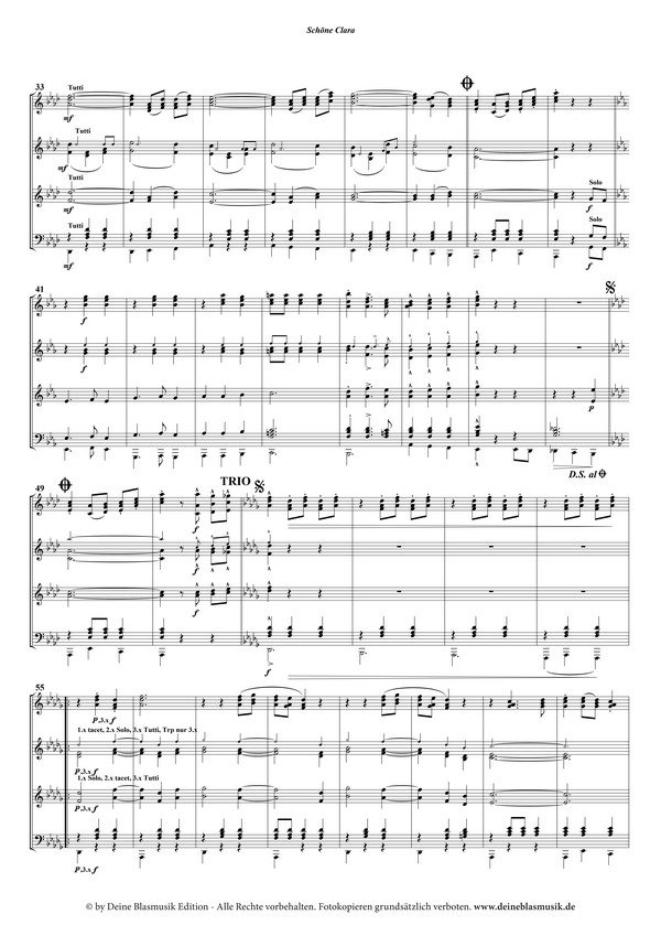 Kuhn, Michael, arr. Man(n) trifft ein schönes Mädchen, verliert sich in ihren Augen und vergisst dabei vollkommen dass die Uhr sich weiter dreht. Die Zeit des Ades ist gekommen, beide müssen Abschied nehmen und zurück bleibt der Traum und die Hoffnung, dass man die 'Schöne Clara' schon bald wieder sieht. Michael Koller als Komponist und Michael Kuhn als Bearbeiter zeichnen verantwortlich für diesen wunderschönen und melodiösen Walzer, der optional natürlich auch ohne Gesang aufgeführt werden kann.