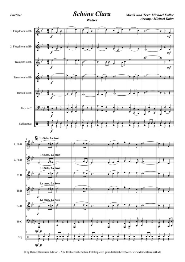Kuhn, Michael, arr. Man(n) trifft ein schönes Mädchen, verliert sich in ihren Augen und vergisst dabei vollkommen dass die Uhr sich weiter dreht. Die Zeit des Ades ist gekommen, beide müssen Abschied nehmen und zurück bleibt der Traum und die Hoffnung, dass man die 'Schöne Clara' schon bald wieder sieht. Michael Koller als Komponist und Michael Kuhn als Bearbeiter zeichnen verantwortlich für diesen wunderschönen und melodiösen Walzer, der optional natürlich auch ohne Gesang aufgeführt werden kann.