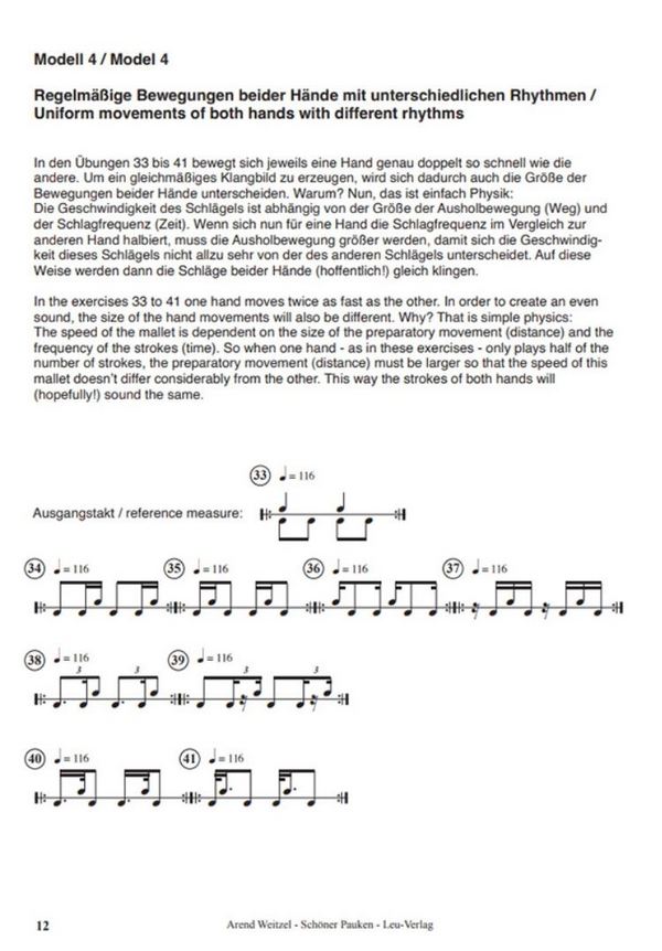 Rhythmische Genauigkeit durch fließende Bewegungen Rhythmic Accuracy through flowing Movements Beim Pauken produzieren wir unsere Töne mit den Bewegungen der Hände und Arme. Wenn wir rhythmische Genauigkeit anstreben, sollten wir also die Bewegungen dementsprechend organisieren und strukturieren. Aber was bedeutet das? Wie mussen Bewegungen beschaffen sein, damit sie rhythmische Genauigkeit begunstigen? Wenn sich Einzelbewegungen ununterbrochen immer gleich wiederholen, entstehen regelmäßige bzw. zyklische Bewegungsabläufe. Weil sie wegen ihrer Gleichförmigkeit so berechenbar sind, eignen sich gerade Bewegungsabläufe dieser Art fur unsere Zwecke ganz besonders. Wir alle kennen zyklische Bewegungsabläufe beispielsweise vom Gehen, wenn wir von A nach B gelangen wollen. Einmal in Gang gesetzt, laufen (buchstäblich!) die Bewegungen prinzipiell nach dem immer gleichen Muster ab. Und zwar weitestgehend automatisch. Es ist nicht notwendig, die einzelnen Schritte jeweils gesondert zu beauftragen. Auch die Schrittgröße und die Schrittgeschwindigkeit ändern sich nur durch eine bewusste Entscheidung unsererseits. Diese Autonomie der Bewegungen hat den Vorteil, dass wir zeitgleich andere Dinge tun können: wir können uns nebenbei unterhalten, mit den Händen etwas tun, etc. Diese autonome Regelmäßigkeit ist aber keine Qualität, die nur unseren Fußen und Beinen vorbehalten ist. Als ehemalige Vierbeiner sind auch unsere Hände und Arme grundsätzlich dazu befähigt. Wenn ich beispielsweise mit einer Hand eine fließende, kontinuierliche Folge von Schlägen spiele, denke ich hierbei nicht an Dinge wie Tempo, Rhythmus, Metrum o.ä. Unabhängig von der obligatorischen akustischen Kontrolle des Geschehens ist es mir ganz besonders wichtig, die Regelmäßigkeit der Bewegungen zu fuhlen, die sich auf verschiedene Weise bemerkbar macht: durch die immer gleiche Bewegungsgröße durch die immer gleiche Bewegungsgeschwindigkeit durch die immer gleiche Aktivität der beteiligten Muskeln durch die immer gleiche 'Antwort' (rebound) des schwingenden Fells Auch hier ist es so, dass diese Schläge quasi autonom ablaufen, was mir wiederum die Möglichkeit eröffnet, mit der anderen Hand etwas anderes zu tun. Und das ist gut so, denn wir sollen ja nicht immer nur gleichbleibende Schlagfolgen pauken. Hinsichtlich der angestrebten rhythmischen Genauigkeit besteht nun die Herausforderung darin, auch bei komplexeren Rhythmen möglichst viel von der Berechenbarkeit und Verlässlichkeit zyklischer Bewegungsabläufe zu bewahren. Je mehr sich die einzelnen Bewegungen zu einem kontinuierlichen Bewegungsfluss verbinden, und je besser sich die Bewegungen der einzelnen Hände miteinander verzahnen, desto ruhiger und berechenbarer werden die Bewegungen, was sich unmittelbar auf die rhythmische Zuverlässigkeit auswirkt. Im Idealfall entsteht hierbei bisweilen ein Gefuhl, das manch einer vielleicht vom Jonglieren kennt: ein lustvolles Ineinandergreifen der Aktivitäten beider Hände, bei dem es nie zu einem Stillstand kommt. Dass sich das Ganze auch noch positiv auf den Klang auswirkt und ganz nebenbei tatsächlich eine ganz eigene Ästhetik mit sich bringt, ist naturlich sehr willkommen. Wie genau so etwas beim Pauken durch Koordination der beiden Hände und behutsame Modifikation regelmäßiger Schlagabfolgen gelingen kann, wird das Thema der nachfolgenden Übungen sein. Und die funktionieren folgendermaßen: Es werden beispielhaft 13 unterschiedliche Bewegungs- bzw. Koordinationsmodelle behandelt. Bei jedem dieser Modelle wird zu Beginn das jeweilige Prinzip im sogenannten Ausgangstakt vorgestellt. Hier arbeiten die Hände zunächst synchron. Auf diese Weise kann gut kontrolliert werden, ob die Qualität der Bewegungen auf beiden Seiten identisch ist. Anschließend spielen die Hände mit genau denselben Bewegungen zeitlich versetzt, was zu rhythmischen Veränderungen fuhrt. Wichtig ist hierbei, dass die angegebenen Tempoangaben genau beachtet werden. Außerdem sollten alle Übungen mit ausreichend großen Bewegungen gespielt werden (im forte -Bereich), um die Koordinationsvorgänge gut nachvollziehbar zu machen. Anstelle von Handsätzen habe ich eine Notation gewählt, bei der die Noten der einen Hand uber der Linie, die Noten der anderen Hand unter der Linie zu finden sind. Ich empfehle, jedes Modell zunächst mit ein und derselben Rollenverteilung durchzuarbeiten (z.B. linke Hand oben, rechte Hand unten) und danach das Ganze mit vertauschten Rollen zu wiederholen. Die einzelnen Übungstakte sollten außerdem auf zweierlei Art geubt werden: Mit Wiederholungen (als ununterbrochener Loop). Als abgesetzte Einzeltakte, um sowohl die Ausholbewegungen aus dem Stillstand als auch den Abschluss der Bewegungen zu uben. Hier sei darauf hingewiesen, dass nach ausnahmslos jedem Schlag der Schlägel aktiv aus dem Fell gefuhrt wird: Entweder schließt sich direkt der nächste Schlag an oder es folgt ein Zwischenschwung oder die Bewegung des Schlägels endet nach dieser letzten Bewegung aus dem Fell heraus. When we play timpani, we produce our sounds through the movements of our hands and arms. When we strive for rhythmic precision, we should therefore accordingly organize and give structure to these motions. But what does that mean? How can movements be executed, in order for them to be favourable for precision? When single movements are constantly repeated without interruption, they develop into regular cyclical motion sequences. And since they are so uniform and predictable, they are particularly suitable for our purposes. Examples of cyclical motion sequences are familiar to us through walking, when we want to get from point A to point B. Once we get started, the movements always follow the same patterns, largely automatically. It's not necessary to consciously command the individual steps. The size and speed of our steps change only through a conscious decision on our part. This autonomy and independence of movement has 
