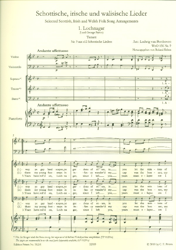 Erben, Roland, ed WoO152-157 Lochnagar WoO156,9 (STB) Ye Shepherds WoO156,4 (STB) Faithfu' Johnie op.108,20 (ST/SB) Farewell blis WoO152,20 (TB) The Soldier WoO157,2 (S) The Pulse of an Irishman WoO154,4 (T) Enchantress farewell op.108,18 (T) The Chace of the Wolf - Sion the Son of Evan WoO155,1 (ST/TBar) O might I but my Patrick love WoO153,16 (S) Sally in our Alley op.108,25 (T) Duncan Gray WoO156,2 (STB) Sunset op.108,2 (S/T) The Soldier in a foreign Land (WoO154,11 (ST) Come fill fill my good Fellow op.108,13 (STB) Auld lang syne WoO156,11 (STB)