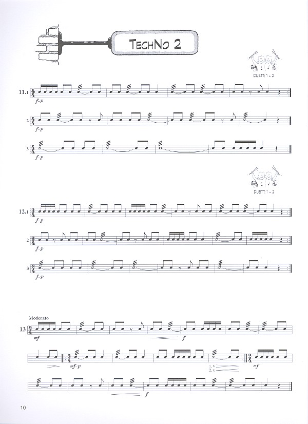 Tom, der Schlagzeuger, begleitet junge Anfänger durch alle drei Bände der Schule für Snare Drum. Der zweite Band knüpft an die gelungene Mischung aus so genannten Technos, die neue Rhythmen und Techniken enthalten, und Solo- und Ensemblestücken an. Darüber hinaus werden die Schüler mit dem Konzept Hören, schauen und spielen an ein lockeres und kreatives Spiel herangeführt. Der dritte Band knüpft an die gewohnte Struktur von Band 2 an. Es gibt jede Menge Akzent- und Wirbelübungen, die wichtigsten Rudiments werden gezeigt, neue Taktarten erlernt und auch improvisiert. Mit der Schule für Snare Drum ist die Koordination von Timing, Technik und Klang baldkein Problem mehr!