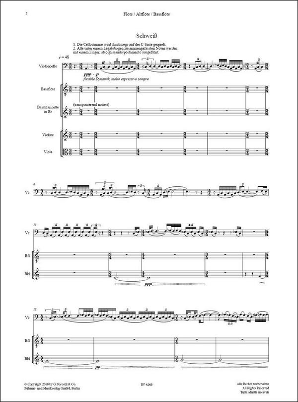 | Untertitel: | für Violoncello, Bassflöte, Bassklarinette, Violine und Viola Stimmen |