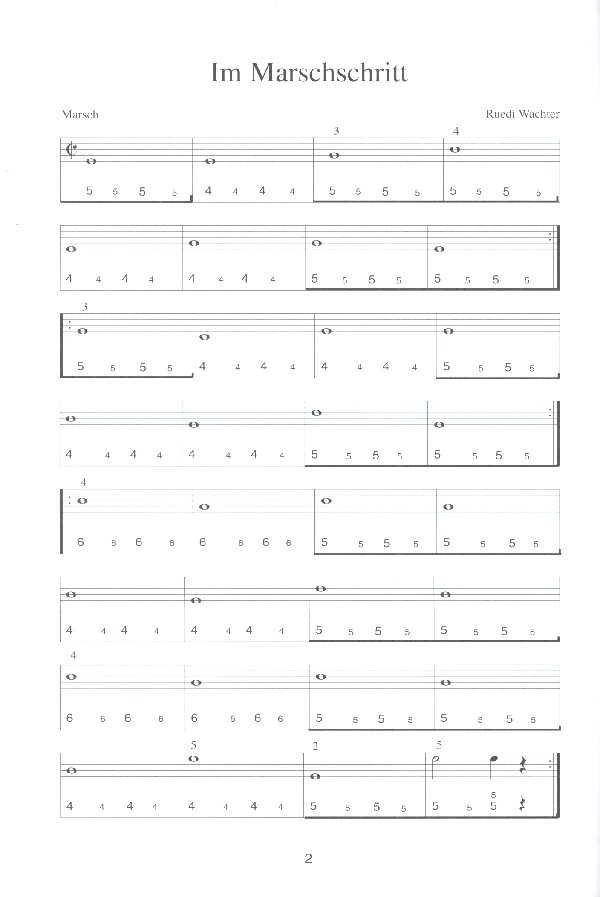 Im Marschschritt Im Garten Langsam aber sicher En g' Spass Bleib gesund Spiel mit Elan Alpenfrieden Kuckuck Cancan Immer luschtig Einfach klar Rund ume Schöne Ferien Old Mac Donald had a Farm The yellow rose Lang lang ist's her Good night Ladies Ein schöner Abend Landbummel Oh when the Saints Im Summer wenns schön abig isch Prärie-Stimmung Uf de Rutschbahn Red River Valley Tom Dooley Uf em Tanz Uf de Abfahrt Min Vater isch en Appenzöller Dr Frechdachs Im Rebstock Rorschachterberg