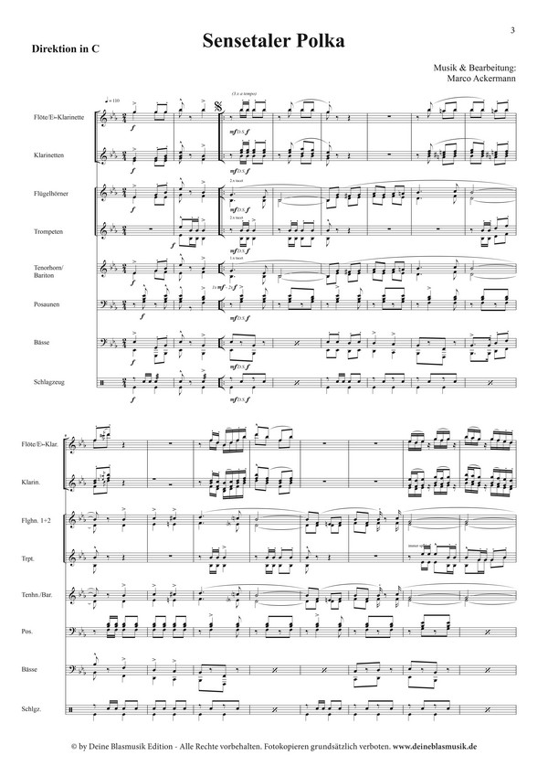 Erleben Sie mit der ""Sensetaler Polka"" die Magie des Sensetals! Dieses idyllische Tal entlang der Sense, die als natürliche Grenze zwischen den Kantonen Freiburg und Bern fließt, begeistert mit sanften Hügeln, dichten Wäldern und charmanten Dörfern. Der Schweizer Komponist Marco Ackermann hat die Schönheit dieser Region in einem farbenfrohen Arrangement für Blasorchester eingefangen. Lassen Sie sich von dieser musikalischen Reise inspirieren - ein Genuss für alle Liebhaber traditioneller Klänge und beeindruckender Landschaften!