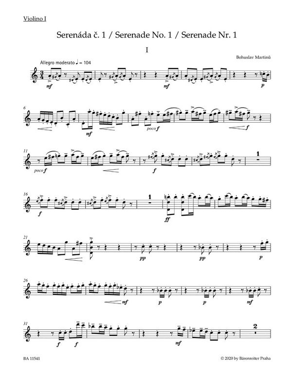 Ersetzt H1500 Zichová, Jitka, ed In den Kammermusikwerken Bohuslav Martinus (1890-1959) waren ungewöhnliche Besetzungen der Instrumente keine Ausnahme, vor allem seine in Paris in den 20er und 30er Jahren entstandenen Werke sind vom Experimentieren in Klang und Form geprägt. Aus dieser Zeit stammen auch vier kleine Serenaden, von denen die Serenade Nr. 1 im Jahr 1932 komponiert wurde. Die Serenaden sind im Jahr 1949 im Prager Verlag Melantrich erschienen. Obwohl die Studienpartitur der Serenade Nr. 1 noch zu Lebzeiten des Komponisten herausgegeben wurde, war er an der Vorbereitung dieser Edition nicht beteiligt, und ohne seine Beteiligung ist im Jahre 1954 auch das Aufführungsmaterial erschienen. Aus diesem Grund wurde als Hauptquelle für die vorliegende Edition die autographe Partitur gewählt.