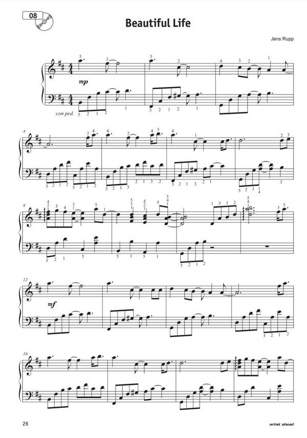 The romantic Song Collection The sweetest Thing A Letter to Sarah Dance of Love Kate's melody Princess A Night in Paris Eve's Delight Beautiful life Lucky Heart Celtic Spirit Escape to Paradise Dreaming of You 12 romantische Kompositionen für alle Pianistinnen & Pianisten, die gerne Stücke spielen möchten, die anspruchsvoll und schön klingen, aber trotzdem relativ schnell zu Erlernen sind. 'Shades of Piano' ist eine Sammlung außergewöhnlicher Klavierstücke mit eingängigen Melodien und moderner Begleitung, die manchmal auch an die liebevoll-verträumte Filmmusik zur Fabelhaften Welt der Amélie, Ziemlich beste Freunde oder auch an das beliebte Stück River Flows In You von Yiruma erinnern. Sie sind geprägt vom einzigartigen Stil des Komponisten, der Sie auf eine bezaubernde Reise durch zeitgemäße Romantik, etwas Impressionismus und die Moderne mitnehmen möchte. Die vorliegenden Klavierkompositionen sind mittelschwer arrangiert und enthalten zum Teil kurze, ausnotierte Improvisationsteile (Solokadenzen) mit denen die Grundlagen für zukünftige, eigene freie Improvisationen und Variationen gelegt werden. Somit besteht für jeden die Möglichkeit, die Stücke für sich selbst neu zu entdecken und auf persönliche Weise zu interpretieren. Die Kompositionen wurden vom Autor selbst am Klavier eingespielt und werden zum Download angeboten. Sie dienen als Hörbeispiel und Lernhilfe und sind auch als Soundtrack für unterwegs ein Genuss. Mit 'Shades of Piano' ist dem Komponisten Jens Rupp erneut ein wahres Schatzkästchen eingängiger, zeitgemäßer Klaviermusik gelungen, die einfach Spaß macht, das Arbeiten mit einer klassischen Schule sinnvoll ergänzt und sowohl Klavierspieler als auch Zuhörer gleichermaßen verzaubert. Download-Material & Audio-CD Unter www.artist-ahead-download.de stehen die enthaltenen Klavierstücke als Audio- und MP3-Dateien zum Download zur Verfügung.