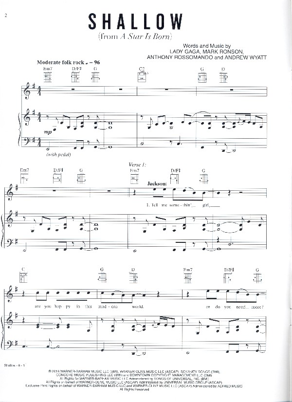 Ronson, Mark, co-author Rossomando, Anthony, co-author Wyatt, Andrew, Koautor Music from the original Motion Picture Soundtrack A Star is born Lady Gaga, performer Bradley Cooper, performer The first single from 2018's remake of the classic film A Star Is Born has been arranged for piano/vocal/guitar. Written by hitmakers Lady Gaga, Mark Ronson, Anthony Rossomando, and Andrew Wyatt, this folk-rock ballad contains emotive lyrics sung as a duet and took the GRAMMY«-Award and Oscar for Best Original Song. Movie artwork is also included with this Original Sheet Music Edition.