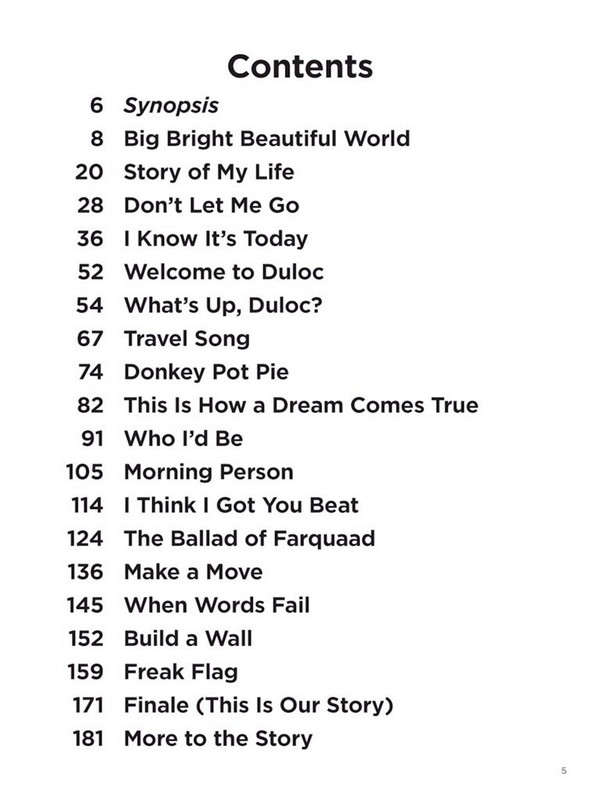 Lindsay-Abaire, David, lyrics Big bright beautiful World Build a Wall Donkey Pot Pie Don't let me go Finale (This is our Story) Freak Flag I know it's today I think I got You Beat Make a Move More to the Story Morning Person Story of my Life The Ballad of Farquaad This is how a Dream comes true Travel Song What's up Duloc When Words fail Who I'd be