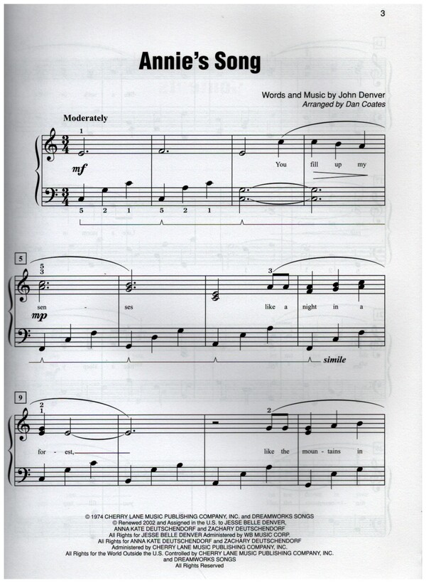 Coates, Dan, arr. Annie's Song The Dance Desperado Don't it make my brown Eyes blue Don't rock the Jukebox How do I live I cross my Heart I swear Inside your Heaven Lane's Theme Let me let go Live like You were Dying Somebody like You Something that we do Stand by your Man Sunshine on my Shoulders This Kiss Your cheatin' Heart