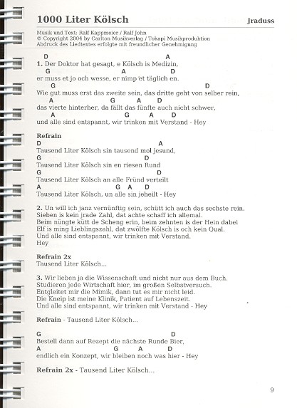 Willizil, Franz-Martin, ed Das kölsche Liederbuch 201 kölsche Kultlieder 1000 Liter Kölsch Aber heut' sind wir fidel Achterbahn Alle woll'n das Eine Alles was ich will Altbier-Lied Alte Liebe macht Flügel im Bauch Am 30. Mai ist der Weltuntergang Am Aschermittwoch ist alles vorbei Am Dom zo Kölle Am Eigelstein es Musik Auf die Bäume ihr Affen Ävver Kaffee koche künne kann se jot Bei uns am Rhing Beim Toni aan d'r Iesbud Bier und 'nen Appelkorn Bitte kein Altbier Brauhaustour Buenos dias Mathias Buuredanz Bye bye my Love Dä Döner määt mich schöner Dä Hennes (FC-Lied) Däm Schmitz sing Frau es durchgebrannt Das kannst du nicht ahnen Das Matterhorn Dat es d'r kölsche Fastelovend Dat es ne jode Lade he Dat Wasser vun Kölle De Mama kritt schon widder e Kind De Wienanz han 'nen Has em Pott Denn et Heimwih nimms de met Denn wenn et Trömmelche jeiht Der Hirtenknabe von St.Kathrein Der liebe Gott weiß dass ich kein Engel bin Der Lu-Lu-Lukas-Song Der schönste Platz ist immer an der Theke Der Schunkelsong Der treue Husar Der weißeste Mann am Strand Der Ziegenbock Dicke Mädchen haben schöne Namen Die Drei vun der Linie 2 Die Hände zum Himmel Die hinger de Gadinge stonn und spinxe Die Hüs'cher bunt om Aldermaat Die Karawane zieht weiter Die Mösch Die Nacht ist sowieso im Eimer Die Rose Die Vögelein vom Titicacasee Die wahren Höhner Do beste fies op et Föttche jefalle Do steiht 'ne Schutzmann Do laachs do dich kapott (Das Camping-Lied) D'r Jung D'r Molli D'r Schötzekünning Drink doch eine met Du kannst nixcht treu sein Du kannst von mir alles alles haben Düsseldorf-Lied E paar Grosche för Ihs Echte Fründe Eetz kütt et rut rut rut Einmol em Johr Einmol Prinz zo sin en Kölle am Rhing Einmal am Rhein Em Sommer es et wärm Em Winter dann schneit et En d'r Kaygaß Nr.0 En Kölle jebore Endlich bes de widder do Es ist noch Suppe da Es muss ja keiner wissen Es war im Zillertal Es war in Altenahr Es war in Königswinter Et Kackleed Et Rhein-Panorama Et Spanien-Leed Et Stina muß 'ne Mann hann Frankreich Frankreich Fussball ist unser Leben Gib acht auf den Jahrgang He kütt Kölle Heidewitzka Herr Kapitän Heimweh nach Köln Heut' brennt mein Iglu Heute fährt die 18 bis nach Istanbul Hey Baby - op kölsch Hey Kölle du bes e Jeföhl Hey hey Marie Himmelfahrt Ich ben 'ne Räuber Ich bin klein Ich fahr mit meiner Lisa Ich hab' 3 Haare auf der Brust Ich hab' den Vater Rhein in seinem Bett geseh'n Ich han de Musik bestellt Ich hab' den Wind belauscht Ich han 'nen Deckel Ich häng met Hätz un Siel nur am FC Imma wieda Immer wieder neue Lieder In unserem Veedel Indianer kriesche nit Ist meine Frau nicht fabelhaft Ja wir san mit'm Radl da Jede Jeck ess anders Jetzt geht's los Katrin Kaffeebud Kinddauf-Feß unger Krahnebäume Köbes (Colör) Köbes (Räuber) Kölle Allaf Kölsche Flamm Kölsche Jung Kölsche Mädcher künne bütze Komm wir machen mal 'ne Rheintour Kornblumenblau Kutt erop Kutt erop Kutt erop La bostella Lange Samstag en d'r City Lass das mal den Vater machen Leev Linda Lou Let's go Kölle Lore leih mir dein Herz Loss mer fiere Loss mer zesamme d'r Karneval fiere Loss se schwaade Männerstrip im Waschsalon (Rama Lama Ding Dong) Man müsste nochmal zwanzig sein Mer bruche keiner Mer losse d'r Dom en Kölle MGV Concordia Ming eetste Fründin Minsche wie mir Mir Mädcher han de Botze ahn Mir schenke dä Ahl e paar Blömcher Musik Bier un e Mädche Natascha vorm Pascha Ne Besuch im Zoo Ne miese Lade Neppeser Mädcher Nix em Büggel Nur Kölsch hält uns in Schuss Op de Hohn bes oder Hahn Och wat wor dat fröher schön doch en Colonia Ober schnell noch eine Runde her Och Verwandte dat sin Minsche Ohne dich geht es nicht Op dem Maat Pänz Pänz Pänz Paraplü-Walzer Rheinische LIeder Rheinlandmädel Riebkooche-Walzer Rosalie Rut und wiess Sag 'ens Blootwoosch Schau nicht auf die Uhr Schön ist das Leben Schötzefess Schüchtern Schütt die Sorgen in ein Gläschen Wein Sie will ja nach Sevilla Skandal im Sperrbezirk Spaß muss sein Straßenbahn-Song Strossefess Strossefess (E Kölsch in der Hand) Su lang mer noch am Lääve sind Superjeilezick Trizonesien-Song Über Köln da lacht die Sonne Uns Kulturkamelle (Jeschenke för Kölle) Uns Natalie (A banda) Uns Tante Klara Unsere Stammbaum Övver Meer un Sonne Vater ist der Beste Villa Billa Walzer Wat fott is is fott Wenn all die Jecke Wenn das Wasser im Rhein gold'ner Wein wär' Wenn die Jecke widder trecke Wenn die Sonn schön schingk Wenn nicht jetzt wann dann (Handball-WM 2007) Wer soll das bezahlen Wir kommen alle in den Himmel Wir sind alle kleine Sünderlein Wo es uns Heimat Wo mir sin is Kölle Woröm solle mer ald en de Heija gon Zoff om Höhnerhoff