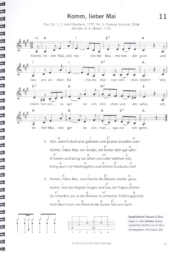 Schmidt, Stefan, ed 100 Volkslieder und Schlager mit Spielhilfen Morgen und Abend Auf, auf zum fröhlichen Jagen Auf, du junger Wandersmann Im Frühtau zu Berge Jeden Morgen geht die Sonne auf Guten Abend, gut' Nacht Kein schöner Land Ade zur guten Nacht Guter Mond, du gehst so stille Die Blümelein, sie schlafen Weißt du, wie viel Sternlein stehen Jahreszeiten Komm, lieber Mai Nun will der Lenz uns grüßen Es tönen die Lieder (Kanon) Alle Vögel sind schon da Der Kuckuck und der Esel Grüß Gott, du schöner Maien Der Mai ist gekommen Geh aus, mein Herz, und suche Freud Bunt sind schon die Wälder Schneewalzer Heimat und Welt Nun ade, du mein lieb Heimatland Heimweh Im schönsten Wiesengrunde Die Loreley Auf der Lüneburger Heide Wo die Nordseewellen (Friesenlied) An der Saale hellem Strande Rennsteig-Lied Wohlauf, die Luft geht frisch und rein La Montanara Als wir jüngst in Regensburg waren Tief drin im Böhmerwald Solang der Alte Peter Es steht eine Mühle im Schwarzwälder Tal Das Kufsteiner Lied (Die Perle Tirols) Wandern und Naturerlebnis Wem Gott will rechte Gunst erweisen Aus grauer Städte Mauern (Wir fahren in die Welt) Wenn die bunten Fahnen wehen Das Wandern ist des Müllers Lust Wer recht in Freuden wandern will Mein Vater war ein Wandersmann Am Brunnen vor dem Tore Bergvagabunden (Wenn wir erklimmen?&) Waldeslust Es klappert die Mühle Ein Männlein steht im Walde Berufe Im Märzen der Bauer Im Wald und auf der Heide Glück auf, der Steiger kommt Seemann, deine Heimat ist das Meer Frohsinn und Geselligkeit Freut euch des Lebens Trink, Brüderlein, trink Ein Vogel wollte Hochzeit machen Zum Tanze, da geht ein Mädel Und jetzt gang i ans Peters Brünnele Ein Jäger aus Kurpfalz Lustig ist das Zigeunerleben Es war einmal ein treuer Husar Und in dem Schneegebirge Wenn das Wasser im Rhein goldner Wein wär Heut kommt der Hans zu mir (Kanon) Auf einem Baum ein Kuckuck Es gibt kein Bier auf Hawaii Im Krug zum grünen Kranze Geburtstag Zum Geburtstag viel Glück Viel Glück und viel Segen (Kanon) Ja, heut ist dein Geburtstag Ein schöner Tag Der Liebe Freud und Leid Ach, wie ist's möglich dann Jetzt kommen die lustigen Tage In einem kühlen Grunde Horch, was kommt von draußen rein Sah ein Knab ein Röslein stehn Muss i denn zum Städtele hinaus Kein Feuer, keine Kohle Dat du min Leevsten büst Wenn alle Brünnlein fließen Du liegst mir im Herzen Ännchen von Tharau Mädel, ruck, ruck, ruck Das Lieben bringt groß Freud Wenn ich ein Vöglein wär Ich hab mein Herz in Heidelberg verloren In einer kleinen Konditorei Aber dich gibt's nur einmal für mich Lebensweisheit Das Hobellied Hoch auf dem gelben Wagen Man müsste noch mal zwanzig sein Üb immer Treu und Redlichkeit Gold und Silber lieb ich sehr Zogen einst fünf wilde Schwäne Wahre Freundschaft soll nicht wanken Die Gedanken sind frei Weihnachtszeit O Tannenbaum Lasst uns froh und munter sein Leise rieselt der Schnee Alle Jahre wieder Am Weihnachtsbaum die Lichter brennen Süßer die Glocken nie klingen Stille Nacht, heilige Nacht