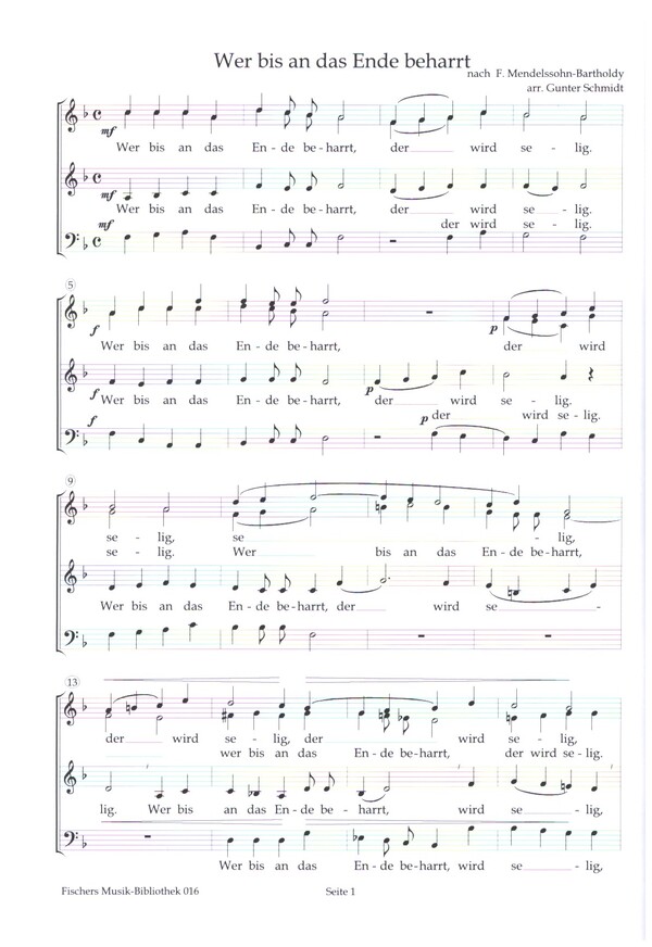 Fischers Musik-Bibliothek Choralsätze für kleine Chöre Singkreis Gießübel, ed AUS DEM ORATORIUM ELIAS (MENDELSSOHN) Wer bis an das Ende beharrt Wirf dein Anliegen auf den Herrn Hebe deine Augen auf Denn er hat seinen Engeln Fürchte dich nicht GEISTLICHE CHORSÄTZE Verleih uns Frieden gnädiglich Auf auf mein Herz mit Freuden Ich lasse dich nicht Ich danke dir Christe Jauchzet alle Lande Gott zu Ehren Kommt her des Königs Aufgebot Lobe den Herren den mächtigen König Harre meine Seele Wachet auf ruft uns die Stimme Gloria sei dir gesungen Mit meinem Gott geh ich zur Ruh Weiß ich den Weg auch nicht WEIHNACHTLICHE CHORSÄTZE Als die Welt verloren Freu dich Erd- und Sternenzelt Heilge Nacht ich grüße dich Maria durch ein Dornwald ging Mit den Hirten will ich gehen Tochter Zion freue dich Wie schön leuchtet der Morgenstern