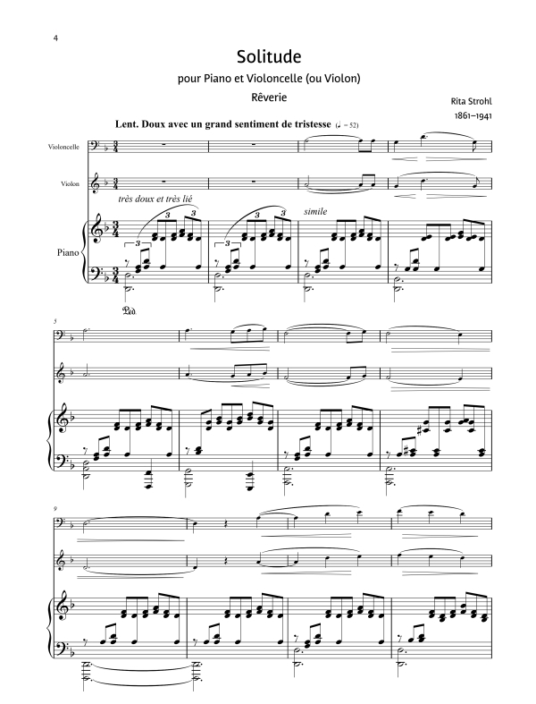 Rêverie »Solitude«, eine »Romance sans parole« - so bezeichnete Rita Strohl (1865-1941) die Miniatur in ihrem handschriftlichen Werkverzeichnis - für Violoncello und Klavier entstand 1887, wurde aber erst zehn Jahre später mit dem Untertitel Rêverie pour Piano et Violoncelle (ou Violon) gedruckt. Die Alternativ-Besetzung, Violine und Klavier, fügte die Musikerin auf Empfehlung des Verlegers der besseren Verkäuflichkeit wegen in die Druckausgabe mit einer separaten Stimme ein. Die Edition beruht auf diesem Erstdruck. Kleine Unterschiede in der Phrasierung wurden belassen, die Dynamik und Notation behutsam vereinheitlicht. »Solitude« ist ein musikalisches Kleinod, das insbesondere die melodiösen Möglichkeiten des Instruments klangvoll ausnutzt. Nach einem lyrischen Beginn, bringt der Mittelteil ein kantables Duo (zwischen Soloinstrument und Klavier) mit einer leidenschaftlichen Steigerung, ehe ein dritter Teil wieder den Bogen zur Anfangsstimmung spannt.