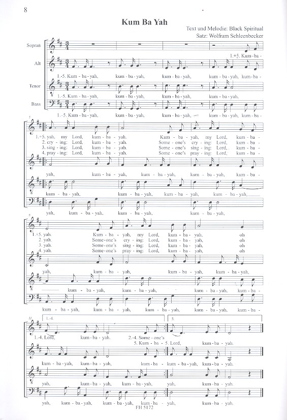 Schleenbecker, Wolfram, arr. Didn't my Lord deliver Daniel Ev'ry Time I feel the Spirit Go tell it on the Mountain I'm on my Way Kum ba yah Nobody knows O happy Day Roll Jordan roll Sometimes I feel like a motherless Child Somebody's knocking at your Door The blind Man stood on the Road They crucified my Lord You must come in at the Door