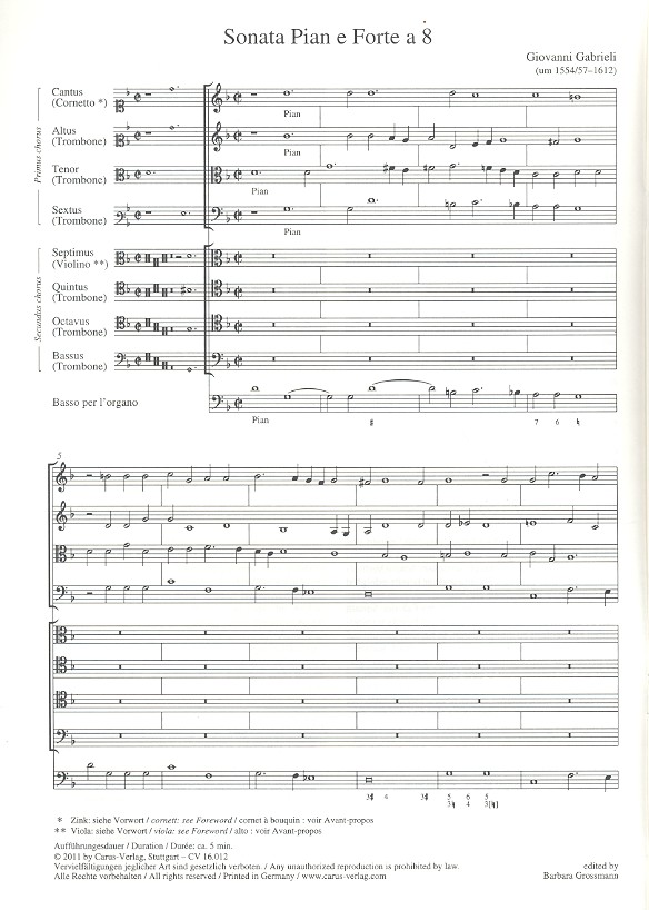Hofmann, Eberhard, ed Canzonen und Sonaten Band 2 Giovanni Gabrielis Sonata Pian e Forte verdankt ihren Namen und ihre Bekanntheit nicht zuletzt der Tatsache, dass sie als eine der ersten Kompositionen überhaupt Angaben zur Dynamik im Notentext enthält. Im Rahmen der Entstehung einer eigenständigen, von der Vokalmusik unabhängigen Instrumentalmusik um die Wende vom 16. zum 17. Jahrhundert zeugt die schriftliche Fixierung solcher aufführungspraktischer Elemente von einer gänzlich neuen kompositorischen Denkweise. Dazu gehört auch die Präzisierung der ausführenden Instrumente durch Gabrieli: zwei Trombonenchöre, die im Diskant von einem Zink bzw. einer Viola angeführt werden. Die vorliegende Edition präsentiert die repräsentativ-feierliche Sonata in einer Kritischen Neuausgabe und stellt zusätzlich - entsprechend der damaligen Aufführungspraxis - eine bezifferte Orgelstimme zur Verfügung.