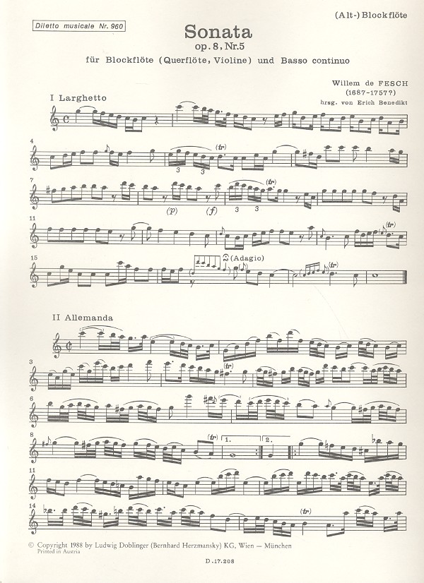 Produktinformationen "Sonate C-Ddur op.8,5 für Blockflöte"