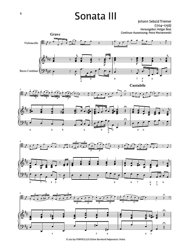 Marianowski, Petra, continuo Johann Sebald (auch Jean Zewalt) Triemer wurde 1704 in Weimar geboren, wo er auch seine erste musikalische Ausbildung erhielt. Sein Weg führte über Hamburg, Paris und Alkmaar nach Amsterdam, wo er sich niederließ und eine Familie gründete. Dort verstarb er im Jahre 1756. Seine VI SONATA a Violoncello Solo con Basso continuo, von denen hier die erste in einer Neuausgabe vorgelegt wird, erschienen ca. 1740 und zählen damit zu den frühesten Cello-Sonaten eines deutschen Komponisten. Mit wenigen Ausnahmen (in der 4. und 6. Sonate) sind die Sonaten in den Halslagen einschließlich Oktavflageolett spielbar und daher bestens für den Unterricht geeignet. Die Ausgabe enthält ein informatives Vorwort, sowie Hinweise zur Interpretation und einen kritischen Bericht. Um den Gebrauch im Unterricht zu erleichtern, liegt eine zusätzliche Stimmausgabe bei, in der die Solostimme durchgehend im Bassschlüssel notiert ist.