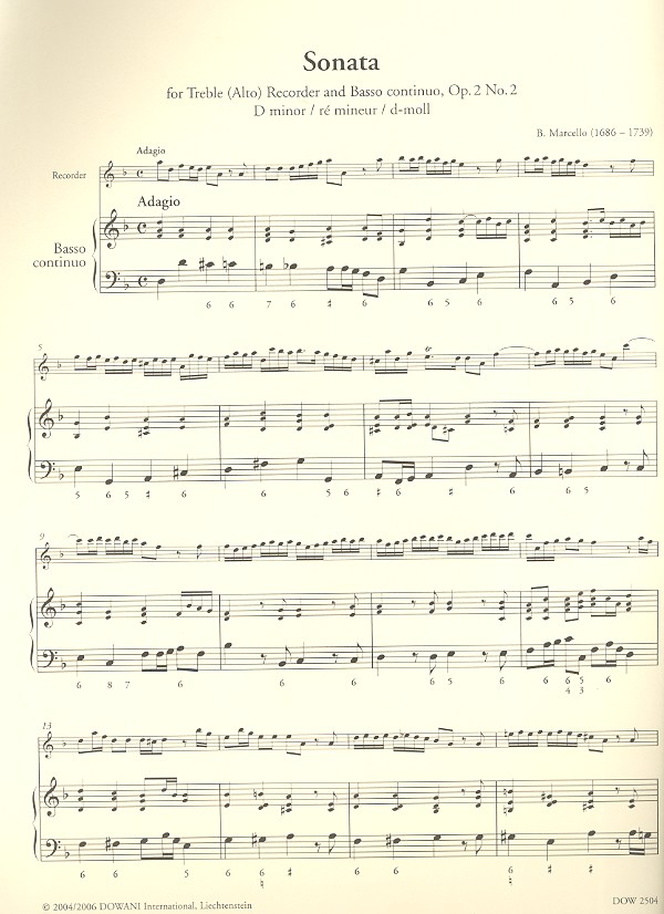 Zimmermann, Manfredo, ed Professor Manfredo Zimmermann - eine anerkannte Kapazität auf seinem Gebiet - hat diese bekannte Sonate von Benedetto Marcello herausgegeben und eingespielt. Da diese Musik ihrem Ursprung entsprechend sehr stark auf improvisatorischen Elementenberuht, wurden nur die nötigsten Verzierungen und Phrasierungen hinzugefügt. Der Spieler oder die Spielerin darf/soll gerne eigene Ergänzungen (Triller, Mordente, Bindungen etc.) vornehmen. Dies gilt natürlich auch für die Ausführung des Generalbasses (Basso continuo oder Cembalo).