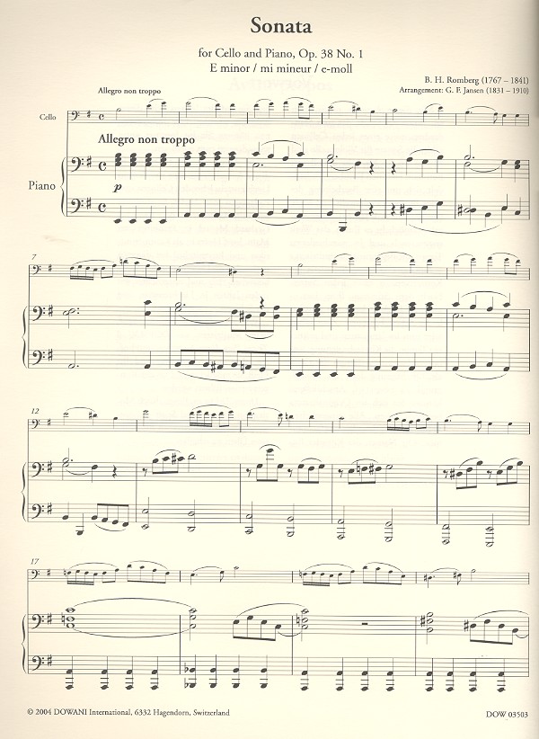 Bernhard Heinrich Rombergs Sonate in e-Moll für Violoncello und Klavier gehört ebenfalls zum Standardrepertoire eines jeden Cellisten. Dieses Stück ist ein Arrangement seines Trios für zwei Violoncelli und Viola. Die bewährte Dowani 3 Tempi Play-Along Ausgabe ermöglicht es Ihnen, das Werk systematisch und in drei verschiedenen Tempi mit professioneller Begleitung zu erarbeiten. 1. Allegro non troppo 2. Andante grazioso 3. Allegretto