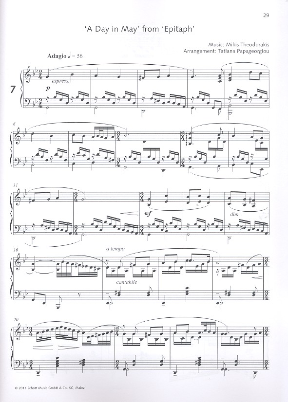 40 Selected Pieces Papageorgiu, Tatiana, arr. Temples in the Shape of the Sky from: Axion Esti In this Neighbourhood from: The Popular Songs Denial from: Epiphany Myrtle from: Archipelago Who Pursues My Live? from: Songs of Struggle Song of Songs from: Mauthausen A Day in May from: Epitaph The Ballad of Andrikos from: Town II I Hold Greece in My Heart from: Children's Song Beside the Sea from: Odyssey Conversation with a Flower from: Eighteen Little Songs of the Bitter Homeland My Mother and the Virgin from: Town I Marina from: Little Cyclades It's Raining in the Poor Neightbourhood from: Town I Here the Light from: Eighteen Songs of the Bitter Homeland Of the Little North Wind from: Little Cyclades Water from: Eighteen Little Songs of the Bitter Homeland I Open the Door in the Evening from: Lyrical Songs I Remember in September from: The Hostage Enchanted Night from: Salutations Three Engaged Men from: Miscellaneous Songs Let Us Rise A Little Higher from: Mythology Margarita, Daughter of May from: Enchanted City Where Has My Boy Flown? from: Epitaph A Prison from: Dionysus The Slaughterhouse from: Songs for Andreas My Love' from the film: Phaedra Rosewater from: Archipelago On Distant Roads from: Lyrical Songs One Day I'll Tell You from: Lyrical Songs Galland Maan from: Songs Of Struggle O Sun of Justice from: Axion Esti Lament from: Songs of Struggle The Letter from: Songs of Struggle On the Eighteenth Day of November from: The Hostage Laughing Boy from: The Hostage Betrayed Love fromthe: Ballad of the Dead Borther Theme from the film: Serpico Make Your Bed Up from: Neighbourhood of Angels Zorba's Dance