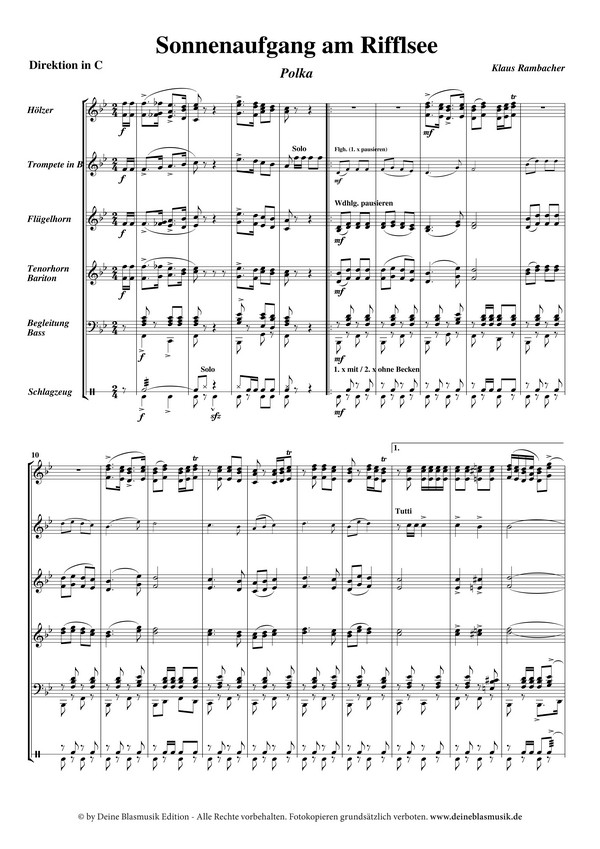 Polka Der Rifflsee, idyllisch gelegen am Ende des Kaunertals, an der Grenze zum Ötztal, ist ein bekanntes Kleinod der Natur. Inspiriert durch eine morgendliche Wanderung um den See, schuf Klaus Rambacher diese Polka. Erinnert die Ruhe im Trio an die Stimmung am Morgen, so spiegelt das Basssolo die schroffen Gipfel des Kaunergrats wider. Wunderbar böhmisch inszeniert, wird das Stück Musikanten und Publikum gleichermaßen begeistern.