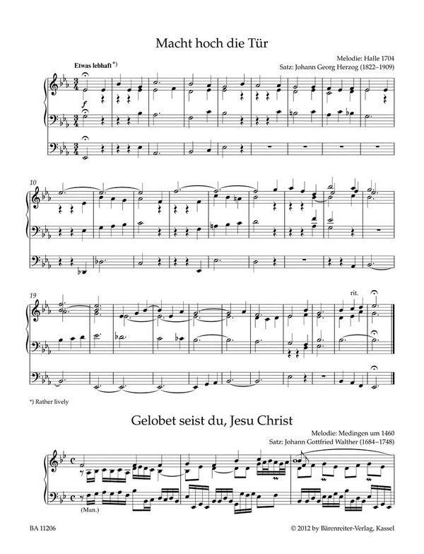 Kircher, Armin, ed Schwemmer, Marius, ed Leichte Orgelmusik für Gottesdienst und Unterricht Advent : Macht hoch die Tür (Herzog) Wachet auf ruft uns die Stimme (Rinck) Weihnachten : Es kam ein Engel hell und klar (Bach) Gelobet seist du Jesu Christ (Walther) Herbei o ihr Gläub'gen (Lefébure-Wely) In dulci jubilo (J. M. Bach) Lobt Gott ihr Christen alle gleich (Buxtehude) Nun freut euch ihr Christen (Lefébure-Wely) Nun singet und seid froh (J. M. Bach) O du fröhliche (Katterfeld) Stille Nacht (Louis Dité) Vom Himmel hoch da komm ich her (Bach) Fastenzeit : Aus tiefer Not schrei ich zu dir (Reger) Herzliebster Jesu was hast du verbrochen (Davin) O Haupt voll Blut und Wunden (J.C. Bach) Ostern : Christ ist erstanden (Rinck) Ihr Christen singet hocherfreut (Paul Vidal) Wir wollen alle fröhlich sein (Faulstich) Christi HImmelfahrt : Christ fuhr gen Himmel (Rinck) Pfingsten : Komm Gott Schöpfer (Vidal) Komm Schöpfer Geist (Horn) Veni Creator Spiritus (Vidal) Lob und Dank : Den Herren will ich loben (Stolze) Großer Gott wir loben dich (Horn) Lobe den Herren (Saffe) Nund danket all und bringet Ehr (Saffe) Nund danket alle Gott (Faulstich) Vertrauen und Bitte : Was Gott tut das ist wohlgetan (Reger) Wer nur den lieben Gott läßt walten (Rinck) Umkehr : Mache dich mein Geist bereit (Hesse) Messgesänge : Allein Gott in der Höh sei Ehr (Herzog) Christe du lamm Gottes (Stolze) Herr Jesu Christ dich zu uns wend (Walther) Liebster Jesu wir sind hier (Kropfreiter) Nun jauchzt dem Herren alle Welt (Faulstich) O wunderbare Speise (Bach) Kommunion : Beim letzten Abendmahle (Hoyer) Fronleichnam : Gottheit tief verborgen (Emmanuel) Pange lingua (Le Burgeois) Maria : Ave Maria klare (Fischer) Tod und Vollendung : Christus der ist mein Leben (Hoyer) Herr ich bin dein Eigentum (Hesse) O Welt ich muss dich lassen (Bach) Valet will ich dir geben (Stolze) Morgenlieder : Aus meines Herzens Grunde (J. C. Bach) Lobet den Herren alle (Herzog) Morgenglanz der Ewigkeit (Palme) Abendlieder : Nun ruhen alle Wälder (Bach) Weihnachten : Lobt Gott ihr Christen (Buxtehude) Ostern : Ihr Christen singet hocherfreut (Vidal) Liebster Jesu wir sind hier (Kropfreiter)