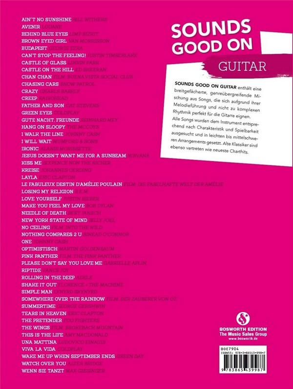 Sounds Good On Guitar enthält eine breitgefächerte, genreübergreifende Mischung aus Songs, die sich aufgrund ihrer Melodieführung und nicht zu komplexen Rhythmik perfekt für die Gitarre eignen. Alle Stücke wurden dem Instrument entsprechend nach Charakteristik und Spielbarkeit ausgesucht und in leichten bis mittelschweren Arrangements gesetzt. Das Songbook hat eine benutzerfreundliche Spiralbindung. Neben Klassikern wie Make You Feel My Love (Bob Dylan), Tears In Heaven (Eric Clapton) oder New York State Of Mind (Billy Joel) beinhaltet das Buch ebenso Charthits der Gegenwart wie Avenir (Louane), Castle On TheHill (Ed Sheeran) oder Love Yourself (Justin Bieber). 50 Songs created for Guitar Ain't no Sunshine Avenir Behind blue Eyes Brown eyed Girl Budapest Can't stop the Feeling Castle of Glass Castle on the Hill Chan Chan Chasing Cars Crazy Creep Father and Son Green Eyes Gute Nacht Freunde Hang on Sloopy I walk the Line I will wait Ironic Jesus doesn't want me for a Sunbeam Kiss me Kreise Layla Le fabuleux destin d'Amélie Poulain Losing my Religion Love yourself Make You feel my Love Needle of Death New York Stat of Mind No Ceiling Nothing compares 2 U One Optimistisch Pink Panther Please don't say You love me Riptide Rolling in the Deep Skake it out Simple Man Somewhere over the Rainbow Summertime Tears in Heaven The Pretender The Wings This is the Life Una mattina Viva la vida Wake me up when September ends Watch over You Wenn sie tanzt
