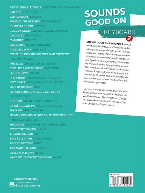 30 Songs speziell ausgewählt Sounds Good On Keyboard 2 enthält eine breitgefächerte, genreübergreifende Mischung aus Songs, die sich perfekt für das Keyboard eignen. Alle Stücke wurden dem Instrument entsprechend nach Charakteristik und Spielbarkeit ausgesucht und in leichten bis mittelschweren Arrangements gesetzt. Die ansprechend und übersichtlich aufbereiteten Songs sind eine willkommene Abwechslung für jeden Instrumentalunterricht und werden von Lehrern wie Schülern gleichermaßen geschätzt. Der nun vorliegende zweite Band für Keyboard enthält eine Auswahl an Stücken, die von Klassikern wie Das Model und Oxygene bis zu aktuellen Charthits wie Bad Guy oder Sweet But Psycho reicht.