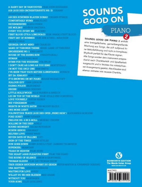 Following the success of Sounds Good On Piano 1, we now bring you the next instalment of this greatly received new series. Sounds Good on Piano 2 contains a cross-genre mix of 50 songs, that are perfect for the piano thanks to their flowing melodies and not too complex rhythms. All songs have been selected for their playability, are set in easy to medium arrangements and contain a wide range of classical music, evergreens and chart hits. The book is also spiralbound, which is very user-friendly. Selection of titles include: Air (Johann Sebastian Bach), Comfortably Numb (Pink Floyd), Game of Thrones Main Theme (Ramin Djawadi), Georgia On My Mind (Ray Charles), Karma Police(Radiohead), Nie vergessen (Alina), One More Light (Linkin Park), Selfish Love (Jessie Ware), Sign Of The Times (Harry Styles) and Whatever It Takes (Imagine Dragons). 50 Songs created for the Piano A Rainy Day In Vancouver Air An Der Schonen Blauen Donau Comfortably Numb Dezemberkind Die Moldau Every You, Every Me First Blood (It's A Long Road) First Day Of Summer Game Of Thrones Theme Georgia On My Mind Gnossienne No. 1 House Of The Rising Sun Human Hymn For The Weekend I Don't Care As Long As You Sing I'm Not The Only One I've Seen That Face Before (Libertango) Ist da jemand? It's Snowing On My Piano Jealous Guy Karma Police Kreise Little Hollywood Liz On Top Of The World Love Yourself Nie vergessen Nights In White Satin One More Light Polowetzer Porz Goret Prelude Nr. 4 in e-moll Rolling In The Deep Round Midnight Schön genug (Akustikversion) Selfish Love Seven Days Of Falling Sign Of The Times Sun Goes Down Supergirl Tears In Heaven The Heart Asks Pleasure First The Sound Of Silence Truman Sleeps Uber Sieben Brucken Mußt Du Gehen Una Mattina Waiting For Love Willst du bei mir bleiben Without You Your Song