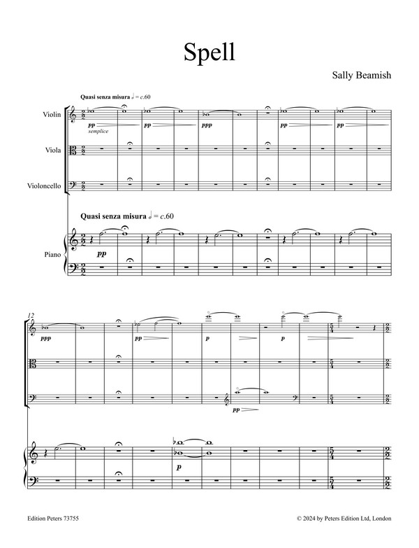 I was asked to write this short piano quartet by the Musik in der Pforte concert series, with the brief that the motto of the season 2024 would be a quote by the American writer and mythologist Joseph Campbell (19041987''Follow your bliss and the universe will open doors where there were only walls. Joseph Campbells concept is the heros journey, which he found in myths of all cultures. Each concert would take an aspect of this journey as its theme, and for my new work, they suggested to me: The Initiation: Between Courage and Despair. I decided to relate this to my own journey, and to the moment which marked the beginning of my commitment as a professional composer, which in turn led to a journey a move from England to Scotland and then a return twenty eight years later. The event which initiated this journey was traumatic: the theft of my viola from a house in South London. I knew immediately that somehow I needed to turn the despair I felt into something positive: I stopped playing, moved to Scotland, and focused fulltime on composing. Twenty-five years later, by an extraordinary turn of events, my youngest child became a luthier. Her first instrument was a viola, which gave me back my voice and a return to performing coinciding with a return to England. This echoes the aspect of Campbells journey wherein the protagonist returns with a lost treasure. This piece is the second* in which Ive used a spelling of my own name, translating the letters (SFBEAMISH) into musical notation. All of these are readily available in the German musical scale, apart from MI, which of course is the note E in solfège. The music explores many emotions, beginning with a gentle exposition leading to a sighing, lyrical second section, then an ebullient scherzo focusing on viola and cello. The music uses solely the letters of my name until the fourth episode, which abandons some notes and adds a G to create a pentatonic sound-world from which emerges a lullaby I wrote when I was first in Scotland. The viola is a ghostly presence in this section, finally calling the instruments back to the original melodic material and leading them in a canon. The penultimate section is a return to the sighing theme at the beginning, this time boldly expressive and building to a climax, followed by a meditative viola cadenza. Predominant throughout the music is the idea of bells. The six sections are punctuated by bell-like refrains, beginning with a single chime, and adding one more at each new section. The final coda consists of 6 bell chimes, fading into the distance. The title Spell has a variety of resonances. The spelling of my name, of course, but also the idea of an event spelling something portentous. It can also mean a spell, or period, of time often of work. And equally significantly, a spell, or charm, which transforms life in unexpected and magical ways. The usual hero adventure begins with someone from whom something has been taken, or who feels there is something lacking in the normal experience available or permitted to the members of society. The person then takes off on a series of adventures beyond the ordinary, either to recover what has been lost or to discover some life-giving elixir. It's usually a cycle, a coming and a returning. Joseph Campbell Spell was commissioned by Musik in der Pforte, and first performed by The Ensemble Louise Farrenc: Berit Cardas, violin, Klaus Christa, viola, Mathias Johansen, cello, and Katya Apekisheva, piano, on May 23rd 2024, at Pförtnerhaus Feldkirch, Austria. *Crescent for trumpet, viola and piano also uses these notes. Sally Beamish 2024'