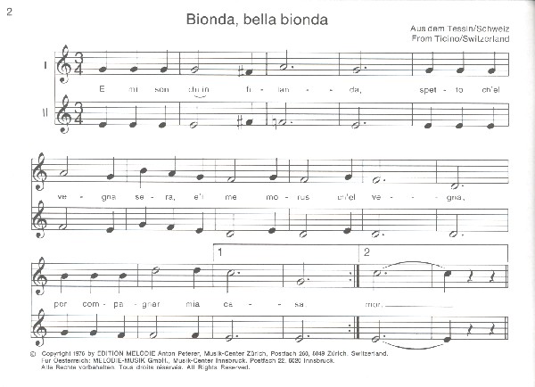 Bodenmann, Hans, ed Bionda bella bionda Da höch uf den Alpe Dei oben of dem Bergli Det äne am Bergli Die Schneckenpost Ein Jäger aus Kurpfalz Es Burebüebli Es war eine Mutter Im Frühling Lobet und preiset Nun grüßen wir O du liebs Ängeli Trara Wir hassen die Sorgen