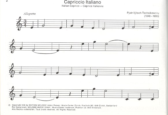 Bodenmann, Hans, ed Capriccio italano (Tschaikowsky) Das klinget so herrlich (Mozart, W.A.) Für Elise (Beethoven) Fröhlicher Landmann (Schumann) Liebestraum (Liszt) Ecossaise (Mozart, W.A.) Marsch (Bach, J.S.) Allegro (Boismortier)