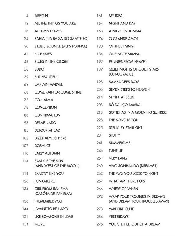 Airegin All The Things You Are Autumn Leaves Bahia (Na Baixa Do Sapateiro) Billie's Bounce (Bill's Bounce) Blue Skies Blues In The Closet Budo But Beautiful Captain Marvel Come Rain Or Come Shine Con Alma Conception Confirmation Desafinado Detour Ahead Dizzy Atmosphere Doralice Early Autumn East Of The Sun (And West Of The Moon) Exactly Like You Funkallero Garota De Ipanema I Remember You I Want To Be Happy Like Someone In Love Move My Ideal Night And Day A Night In Tunisia O Grande Amor Of Thee I Sing One Note Samba (Samba De Uma Nota So) Pennies From Heaven Quiet Nights Of Quiet Stars (Corcovado) Samba Dees Days Seven Steps To Heaven Sippin' At Bells So Danco Samba Softly As In A Morning Sunrise The Song Is You Stella By Starlight Stuffy Summertime Tune Up Very Early Vivo Sonhando (Dreamer) The Way You Look Tonight What Am I Here For? Where Or When Wrap Your Troubles In Dreams (And Dream Your Troubles Away) Yardbird Suite Yesterdays You Stepped Out Of A Dream