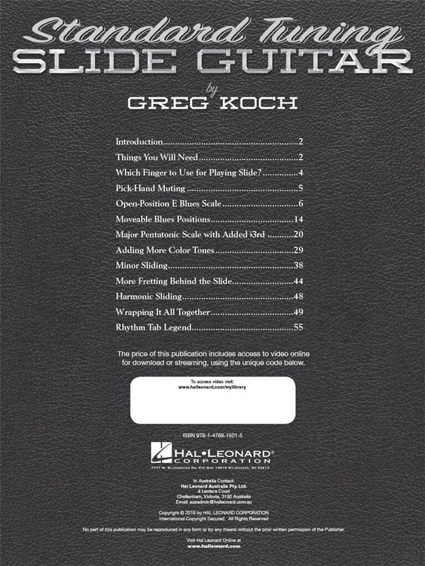 Standard Tuning Slide Guitar is a compilation of slide guitar techniques accumulated by author and über-guitarist Greg Koch for over 30 years. With detailed notation and tablature for over 100 playing examples and video demonstrations, Koch demonstrates how to play convincing blues, rock, country, and gospel-tinged slide guitar while in standard tuning by using techniques and approaches that emulate common altered slide tunings, such as open E or open G. Drawing from a well of influences, from Blind Willie Johnson and Elmore James to Duane Allman and Sonny Landreth, Greg will show you how to create these slide guitar sounds in standard tuning while also providing ideas to inspire the development of your own style.