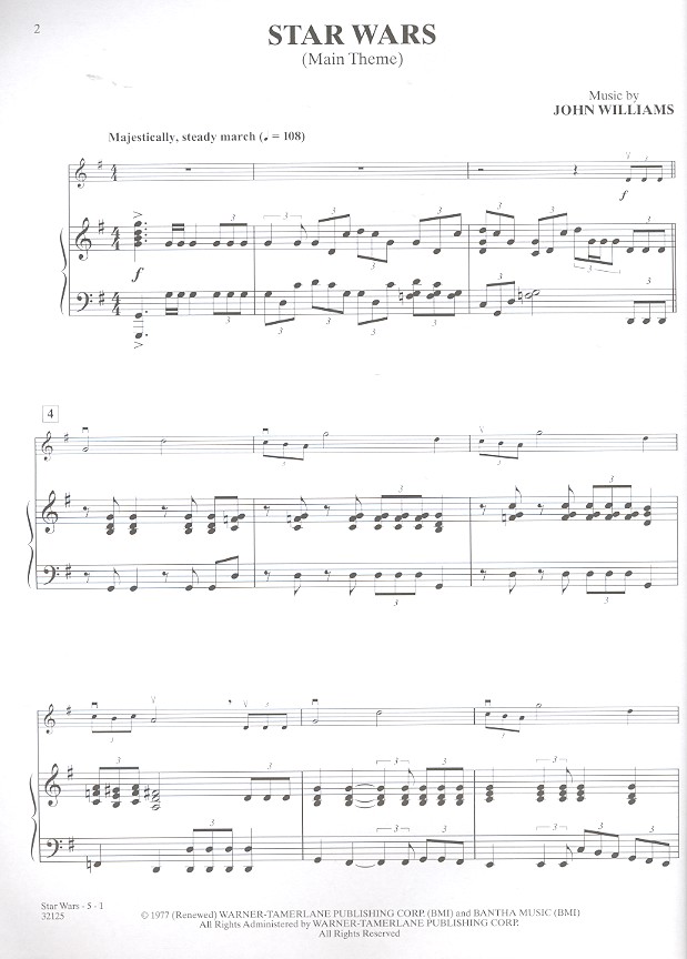 1. Across The Stars (Love Theme) 2. Anakin's Theme 3. Augie's Great Municipal Band 4. Battle of the Heroes 5. Cantina Band 6. Duel of the Fates 7. Jar Jar's Introduction 8. May The Force Be With You 9. Princess Leia's Theme 10. Qui-gon's Funeral 11. Star Wars (Main Theme) 12. The Arena 13. The Flag Parade 14. The Imperial March ( Darth Vader's Theme) 15. The Imperial March (Darth Vader's Theme)16. The Meadow Picnic 17. The Throne Room For the first time, Star Wars« A Musical Journey (Music from Episodes I-VI): Instrumental Solos includes selections from all six Star Wars« movies arranged for flute, clarinet, alto sax, tenor sax, trumpet, horn in F, trombone, piano accompaniment, violin, viola and cello. The arrangements are completely compatible with each other and can be played together or as solos. Due to level considerations regarding keys and instrument ranges, the wind instrument arrangements are not compatible with the string instrument arrangements in this series. Each book contains a carefully edited part that is appropriate for the Level 2--3 player and a fully orchestrated accompaniment recording. Each song on the recording includes a demo track, which features a live instrumental performance, followed by the play-along track itself. Also included is 4-color art as well as black and white art from the movies. This title is available in SmartMusic.
