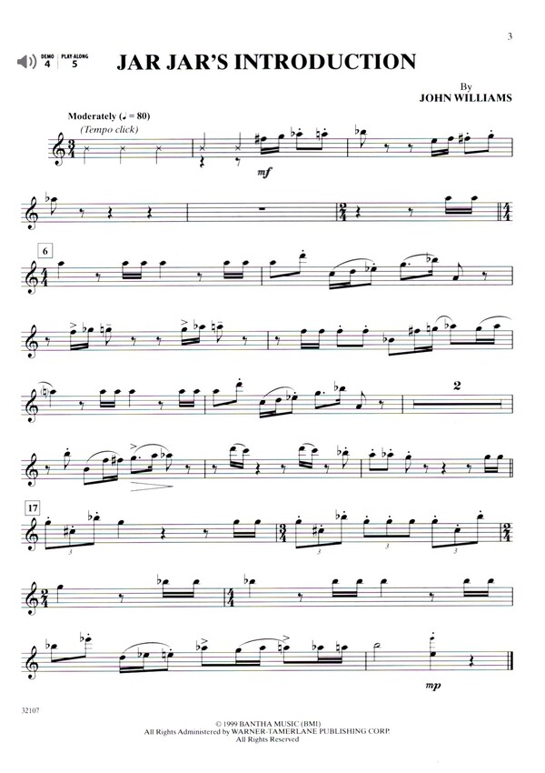 A musical Journey Main Theme Jar Jar's Introduction Augie's great municipal Band Qui-Gon's Funeral Duel of the Fates Anakin's Theme The Flag Parade Across the Stars The Arena The Meadow Picnic Battle of the Heroes Cantina Band The Throne Room The Imperial March May the Force be with You Princess Leia's Theme For the first time, Star Wars« A Musical Journey (Music from Episodes I-VI): Instrumental Solos includes selections from all six Star Wars« movies arranged for flute, clarinet, alto sax, tenor sax, trumpet, horn in F, trombone, piano accompaniment, violin, viola and cello. The arrangements are completely compatible with each other and can be played together or as solos. Due to level considerations regarding keys and instrument ranges, the wind instrument arrangements are not compatible with the string instrument arrangements in this series. Each book contains a carefully edited part that is appropriate for the Level 2--3 player and a fully orchestrated accompaniment CD. Each song on the CD includes a demo track, which features a live instrumental performance, followed by the play-along track itself. Also included is 4-color art as well as black and white art from the movies. This title is available in SmartMusic.