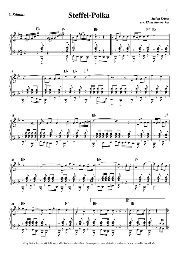Rambacher, Klaus, arr. Polka Die "Steffel-Polka" ist die bislang erste, aber hoffentlich nicht die letzte, Komposition von Stefan Krines, der in seiner unterfränkischen Heimat und darüber hinaus als Kapellmeister bekannt ist. Krines war viele Jahre mit seinen "Egerländer Musikanten Ebelsbach" im tschechischen Skalna (Wildstein) zu Gast. Insbesondere dort wurde er immer wieder gefragt, ob es auch eigene Kompositionen von ihm gäbe. Mit der "Steffel-Polka" ist ihm auf Anhieb ein Volltreffer gelungen. Spannend und abwechslungsreich von Klaus Rambacher arrangiert, überzeugt diese schmissige, böhmische Polka mit tollen Melodienbögen und einem gewagten Stil- und Tempowechsel im Zwischenteil vor der finalen Trio-Wiederholung. Für Musikanten und Publikum ein Ohrenschmaus!