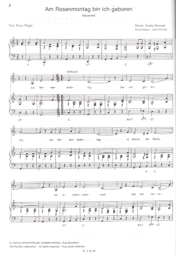 Am Rosenmontag bin ich geboren Bella Italia Das müssen wir noch lernen Der Mann am Klavier Du bist die Rose vom Wörthersee Ein Prosit der Gemütlichkeit En d'r Kaygass Nummer Null Geh' Alte, schau mi net so teppert an Gell du hast mich gelle gern Hier am Rhein geht die Sonne nicht unter Humbta tätärä Ich hab dein Knie gesehn Ich hab den Vater Rhein in seinem Bett gesehn Ich kauf' mir lieber einen Tirolerhut Ja mir san mit'n Radl da Jetzt trink'n ma noch a Flascherl Wein Lustig ist das Zigeunerleben Mainz liegt am Rhein Ole ole Fiesta Petruschka Rucki zucki Schneewalzer Wenn das Wasser im Rhein goldner Wein wär Wir sind die Tramps von der Pfalz