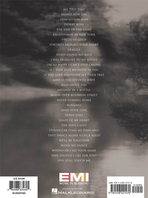 All this Time Brand new Day Demolition Man Desert Rose The End of the Game Englishman in New York Fields of Gold Fortress around your Heart Fragile Heavy Cloud no Rain I was brought to my Senses I'm so happy I can't stop crying If I ever lose my Faith in You If You love Somebody set them free Love is the seventh Wave Mad about You Message in a Bottle Moon over Bourbon Street Never coming home Russians Send your Love Seven Days Shape of my Heart The Soul Cages Stolen Car (Take me Dancing) We'll be together When we dance Whenever I say your Name Why should I cry for You You still touch me