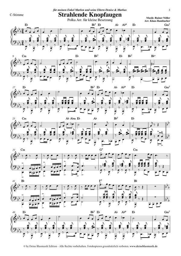Rambacher, Klaus, arr. Polka Mit diesem Erstlingswerk bringt der Komponist Rainer Nöller seinen Stolz und seine Freude über die Geburt seines Enkels zum Ausdruck. Bei der ersten Begegnung und dem Blick in "Strahlende Knopfaugen" war es um Opa geschehen. Klaus Rambacher orchestriert diesen bewegenden Moment liebevoll und zeichnet gekonnt das fröhliche Bild eines Kindes, das unbeschwert in die Zukunft blicken darf. Kurzweilig rhythmisiert und locker vom Holz umspielt, beginnt die Polka mit einem fröhlichen Bogen in den Tenören. Das Trio ist geprägt von einer wunderbar harmonischen Melodieführung und geht sofort ins Ohr. Das Arrangement unterstreicht diese Bögen und verleiht dieser Polka einen ganz besonderen und eigenen Charakter.