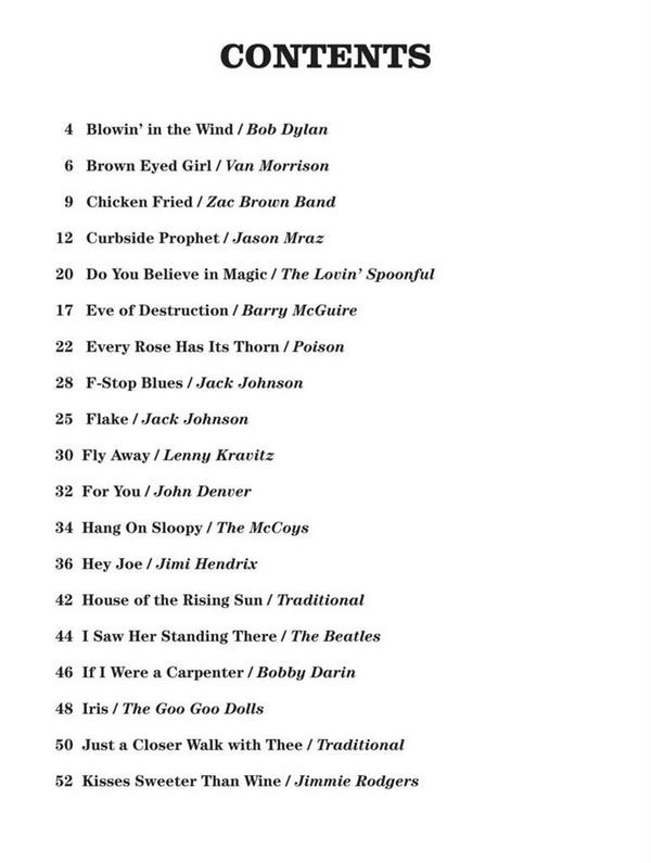 This series provides an unplugged and pared-down approach to your favorite songs - just the chords and the lyrics, with nothing fancy. These 38 easy-to-play arrangements use just five chords, so they are perfect for aspiring musicians as well as pros! Includes: Blowin' in the Wind · Brown Eyed Girl · Eve of Destruction · Every Rose Has Its Thorn · Hang On Sloopy · Hey Joe · Iris · Lights · Maggie May · Sunshine on My Shoulders · Sweet Child o' Mine · Walk on the Wild Side · and more. Songlist: 1. Fly Away 2. For You 3. Walk On The Wild Side 4. We shall overcome 5. Rock and Roll 6. Iris 7. Lights 8. F-Stop Blues 9. Flake 10. Toes 11. Just a Closer Walk With Thee 12. Tonight, Not Again 13. Curbside Prophet 14. Blowin' in the Wind 15. Plane 16. Brown Eyed Girl 17. House of the Rising Sun 18. Waiting On The World To Change 19. Slow Dancing In A Burning Room 20. Vultures 21. Sweet Jane 22. Do You Believe In Magic 23. Chicken Fried 24. Sic 'Em On A Chicken 25. Every Rose Has Its Thorn 26. Eve Of Destruction 27. Hang On Sloopy 28. Hey Joe 29. I Saw Her Standing There 30. If I Were A Carpenter 31. Kisses Sweeter Than Wine 32. Maggie May 33. The Sound Of Silence 34. Sunshine On My Shoulders 35. Sweet Child O' Mine 36. Turn! Turn! Turn! (To Everything There Is A Season) 37. The Unicorn 38. Walk Right In