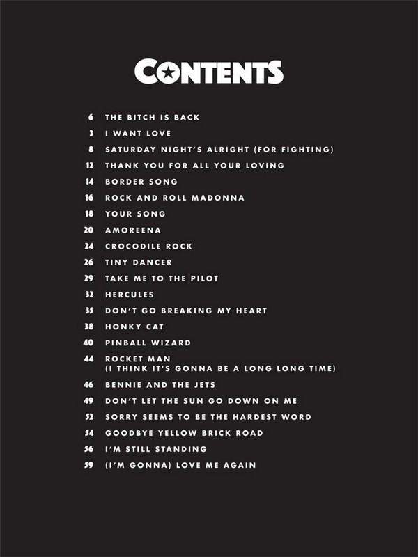 from the Motion Picture Soundtrack Amoreena I Want Love Bennie And The Jets The Bitch Is Back Border Song Hercules Crocodile Rock Don't Go Breaking My Heart Don't Let The Sun Go Down On Me Your Song Goodbye Yellow Brick Road (I'm Gonna) Love Me Again Thank You For All Your Loving Honky Cat I'm Still Standing Pinball Wizard Rock And Roll Madonna Rocket Man (I Think It's Gonna Be A Long Long Time) Saturday Night's Alright (For Fighting) Sorry Seems To Be The Hardest Word Take Me To The Pilot Tiny Dancer
