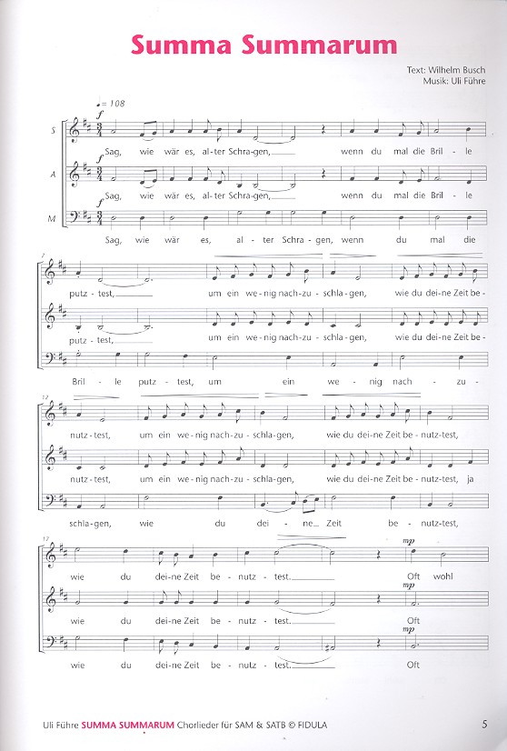 18 Chorlieder Summa summarum The Bottom Line In trauter Verborgenheit Unfrei Förster Püsterich Es geht ganz sacht auf früh Bim bam bum Der Nachtschelm und das Siebenschwein To - Song Chinesische Legende Herbstanfang Es taget vor dem Walde Der Hans im Schnoogeloch Das klein wild Vögelein Die Gedanken sind frei Es geht eine dunkle Wolk Was erzählt uns der Wind
