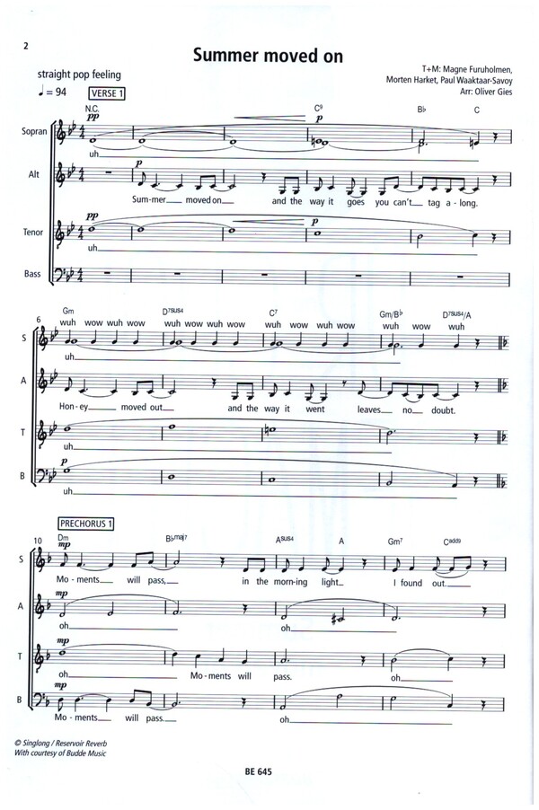 Für Chor gemacht Harket, Morten, Koautor Waaktaar-Savoy, Paul, Koautor Gies, Oliver, arr. 'Summer moved on' war 2000 ein Hit für die norwegische Gruppe 'a-ha', mit dem sie 1998 bei der Verleihung des Friedensnobelpreises auftrat. Eine angenehme Ballade im Stil der 1990er Boygroups. Für die ruhigeren Momente im Konzertprogramm und mit dem Arrangement von Oliver Gies sicher einer der Höhepunkte. 'Honey moved out and the way it went Leaves no doubt'
