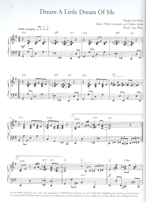 Swing, Evergreens und Pop-Classics Just A Gigolo Basin Street Blues Isn't she Lovely Piano Man Total Eclipse of the Heart Aquarius Cry me a River Dream a little Dream of me 's Wonderful Summertime Watermelon Man In the Mood Baby it's cold Outside Daimonds are A Girl's best Friend All by myself As Time goes by Harlem Nocturne Blue Bossa Honeysuckle Rose Mona Lisa