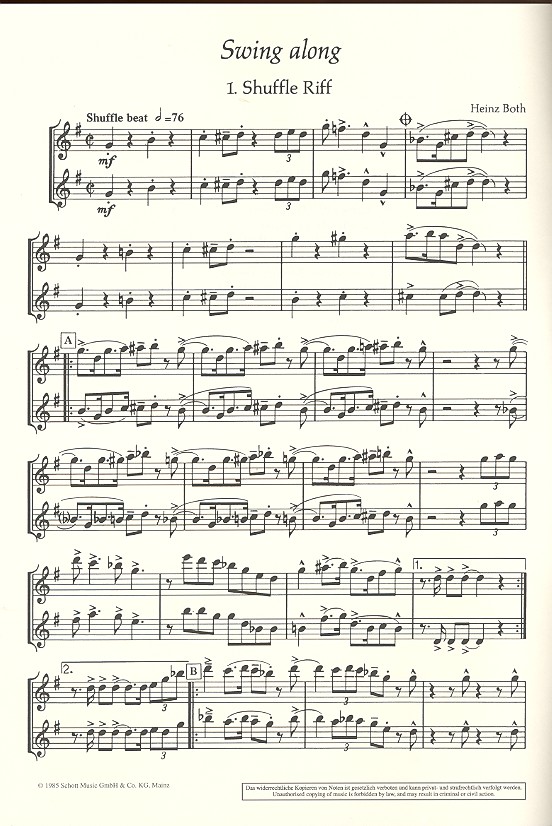 | Untertitel: | für 2 Blasinstrumente in B oder Es (Klarinetten, Saxophone, Trompeten, Einzelstimme - 1. und 2. Stimme in Es (Alt-Saxophon, Horn in Es) |