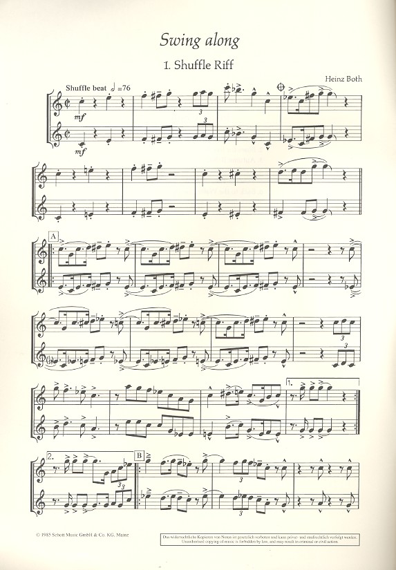 | Untertitel: | für 2 Blasinstrumente in B oder Es (Klarinetten, Saxophone, Trompeten, Einzelstimme - 1. und 2. Stimme in B (Klarinette, Sopran- oder Tenorsa |