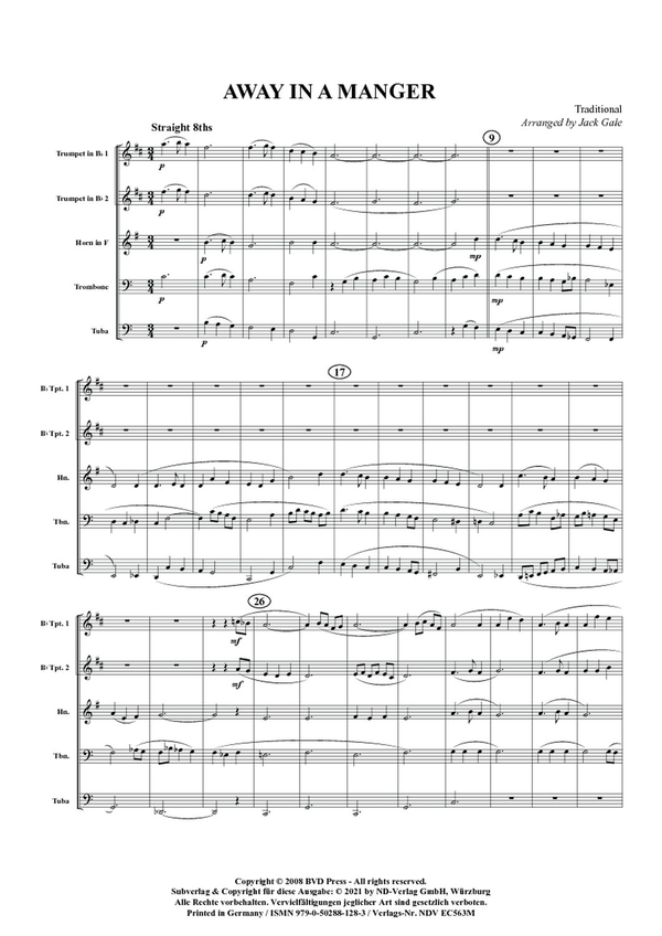 Gale, Jack, arr. Swingin Sounds of Christmas für Blechbläserquintett 3 traditionelle Weihnachtslieder im mittleren und schnellen Swing-Stil. 1. Away in a manger (Straight 8ths) 2. Jingle Bells (Tempo 90 alla breve) 3. Jolly Old St. Nicholas (Medium Swing Feel)
