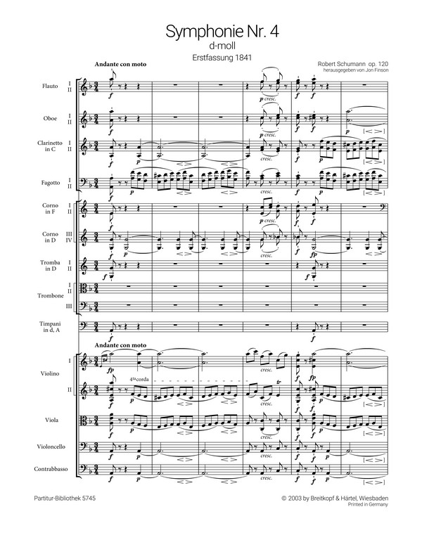 Erstfassung 1841 Unmittelbar nach dem Abschluss seiner 1. Symphonie B-dur op. 38 komponierte Robert Schumann im Jahr 1841 die vorliegende d-moll-Symphonie. Trotz erfolgreicher Uraufführung am 4. Dezember 1841 im Leipziger Gewandhaus blieb diese Erstfassung zu Lebzeiten des Komponisten unveröffentlicht. Kein Geringerer als Johannes Brahms war es schließlich, der ihre Qualitäten erkannte, und sich 1889 tatkräftig und erfolgreich für eine Wiederaufführung einsetzte. Vielen Befürwortern ist zu verdanken, dass heute die beiden Werkfassungen quasi gleichberechtigt nebeneinander stehen und beide im Konzertsaal häufig anzutreffen sind. 1. Andante con moto - Allegro di molto 2. Romanza: Andante 3. Scherzo: Presto 4. Largo - Finale: Allegro vivace