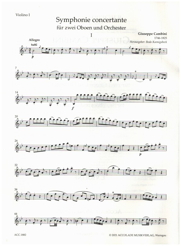Koenigsbeck, Bodo, ed 1. Allegro 2. Adagio cantabile 3. Rondo. Allegro con gratia Die hier nach dem Erstdruck veröffentlichte Symphonie / concertante / Pour deux Hautbois / Par / Giuseppe Cambini erschien erstmals bei Berault, in Paris. Das in Stimmen erhaltene Material weist etliche Unstimmigkeiten auf, die vom Herausgeber behutsam korrigiert wurden. Die spärlichen Angaben zur Artikulation wurden nur dort mit gestrichelten Linien ergänzt, wo es zur praktischen Arbeit notwendig erschien (Angleichung der einzelnen Stimmen). Jeder Solist wird seine eigenen Lösungen einbringen.